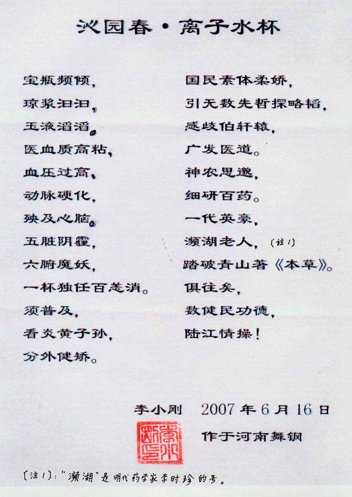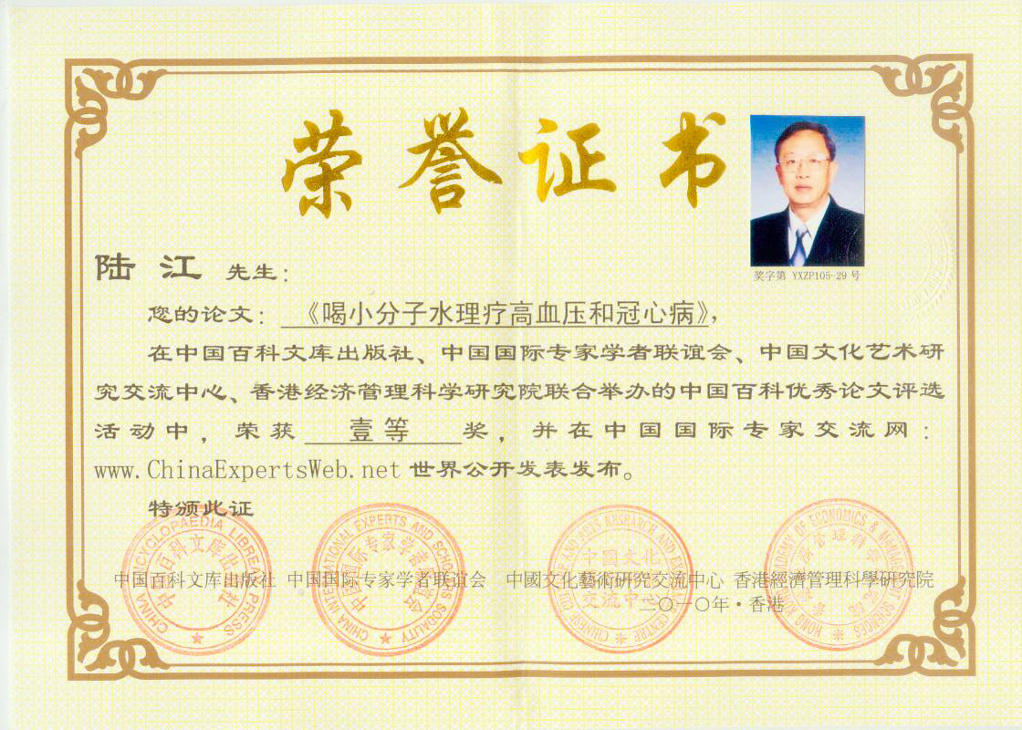 -----我是從事建筑的高工,本來沒有資格去攻克醫學難題,卻為了自身健康才扣響醫學的大門。由于我1990年患高血壓,因怕中風才研究發(fā)明了離子水瓶,我把水處理成微小分子團水,飲用后治愈了高血壓。便于1993年底送到三家省級醫院做臨床試用4個月。經北京和廣西醫學專家鑒定:"降脂降壓效果好"," 能擴大心腦動脈流量,改善心腦電圖以及微循環(huán)","對治療心腦動脈粥樣硬化、高血壓、高血脂有良好的醫療保健作用。""產品的技術性能和療效達到了同類產品的國內領先水平,經廣西醫學科學情報研究所檢索,未見國外有類似報道。"中國醫學科學院張正國教授從美國國立醫學圖書館數據庫存Medline檢索英俄文資料,均未見類似報告。2000年上市后,我為了對消費者負責而繼續(xù)觀察研究,一直通過《信譽卡》和《質量跟蹤調查書》向患者承諾療效,請用戶使用6個月后反饋效果。和脂壓患者飲用2至5個月內,消除癥狀,停服藥物,血壓正常;冠心病患者飲用3~5個月逐漸減輕至消除心絞痛、房顫等癥狀,不再服藥,飲用1年左右心電圖正常,經冠脈造影掃描無明顯狹窄,表明冠心病痊愈。大量患者還反映許多衰弱器官被修復,讓前列腺增生、慢性咽喉炎、慢性氣管炎、支氣管炎、慢性胃炎、腸炎和膽囊炎等不藥而愈;2型糖尿病患者是因為胰島衰弱致病,飲用該水半年至一年,逐漸減藥至停藥,血糖尿糖正常,真正治愈2型糖尿病。中風后遺癥患者飲用六七個月,可逐漸減輕至消除肢體和語言障礙,表明飲用該水能讓壽命很長的神經元細胞逐漸修復,奇跡般地恢復肢體和語言功能。飲用后還使胸腺和脾臟兩個重要的免疫器官被修復和增強,產生免疫細胞多,提高了免疫力,使人不生病或少生病。自此, 飲用微小分子團水創造了攻克冠心病、高(低)血壓和糖尿病三大醫學難題的奇跡。人們對此感到不可思議,但實踐是檢驗真理的唯一標準。