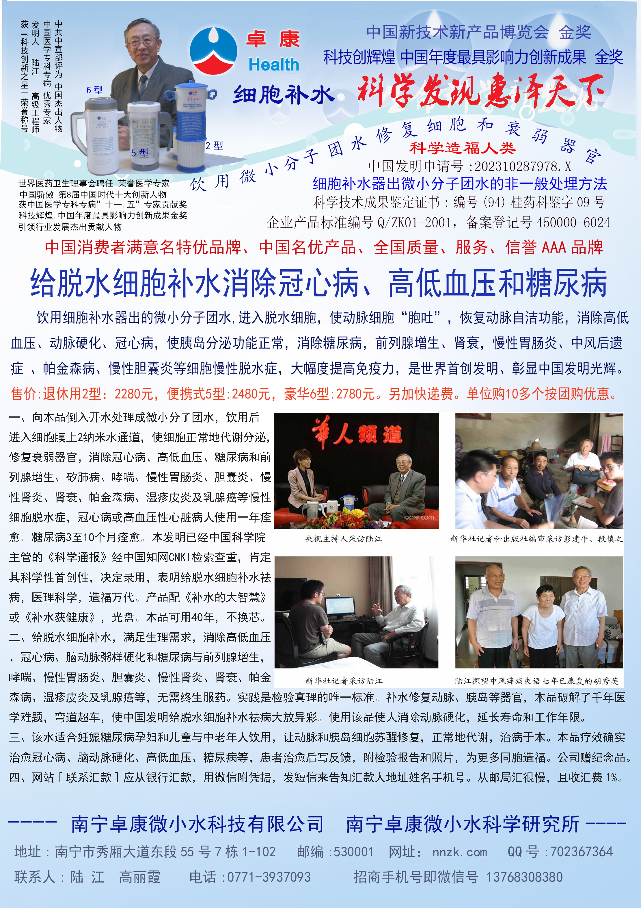 人類幾千年來患以上病癥需終生服藥,幾十年也不能治愈。可是我國南寧的高級工程師陸 江,于1990年想根治高血壓,研究發(fā)明了離子水瓶,處理出微小分子團水供飲用,經過醫院臨床試用和專家鑒定,1999年獲中國發(fā)明專利權,產品于2000年投放市場后一直跟蹤調查,據全國各地用戶反饋:祛除了高低血壓、糖尿病和冠心病,并使前列腺增生、咽喉炎、鼻竇炎、慢性氣管炎、支氣管炎、矽肺病、哮喘、慢性胃炎、腸炎、慢性膽囊炎、慢性腎炎、腎衰、膀胱炎、便秘、痔瘡、風濕性關節(jié)炎和濕疹皮炎及中風后遺癥等病癥不藥而愈。為什么喝微小水能治20多種病?陸 江從1991年德國科學家發(fā)現細胞膜水通道僅為2納米獲得啟發(fā),認為多種器官患病是因細胞脫水,不能正常代謝和分裂增殖,才使器官細胞減少致衰弱萎縮而形成細胞缺水性病癥。22年來的實踐有力地支持了“細胞脫水致病”這一重要論點,表明喝微小水可滿足細胞的生理需求,補水就能祛病,是生命科學新亮點。